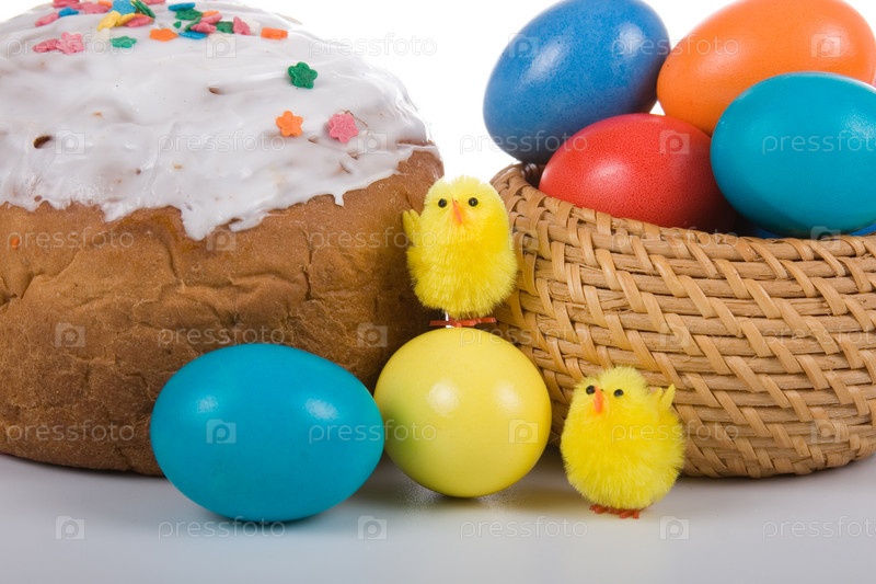 Пасхальные яйца, кулич и цыплята на белом фоне