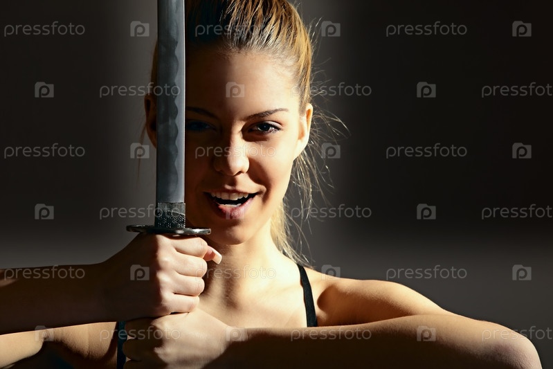 Девушка с катаной на темном фоне