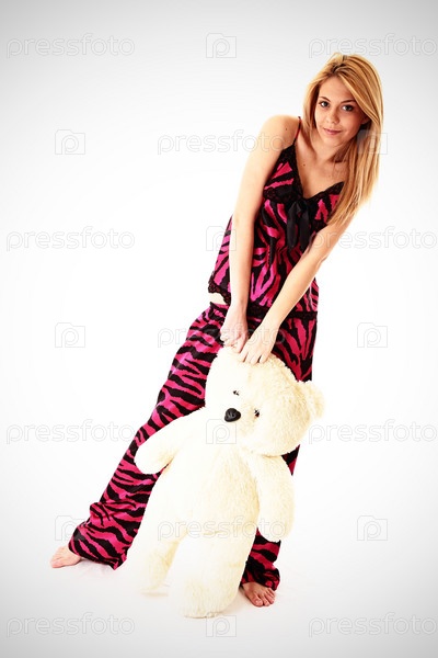 Девушка с игрушкой на светлом фоне