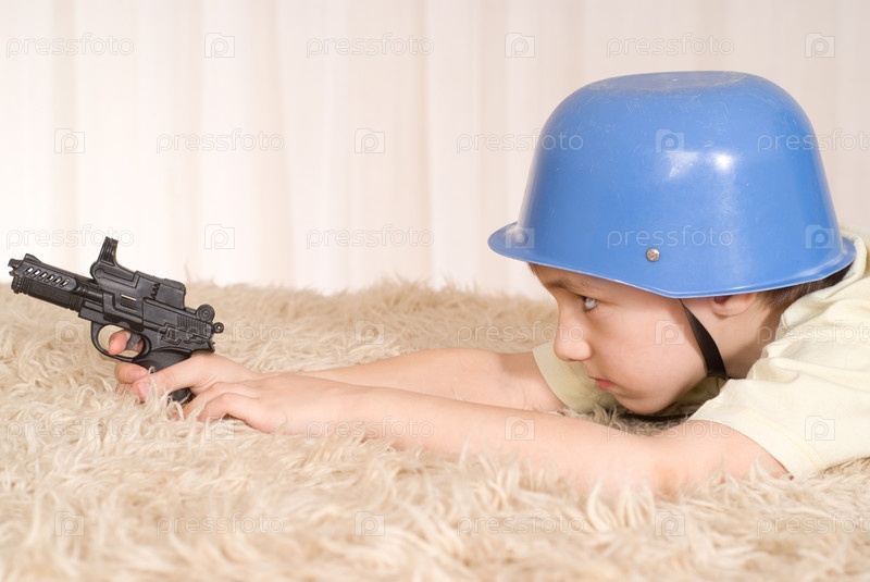 Мальчик в каске с пистолетом в руках