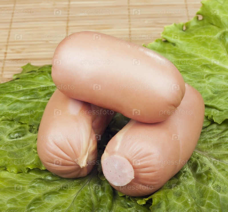 Три сардельки на листе салата крупным планом