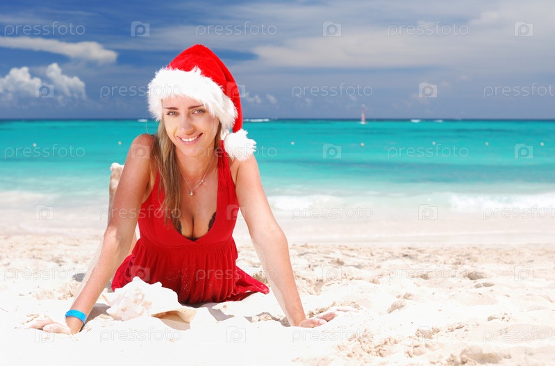 Красивая девушка в новогодней шапке у моря