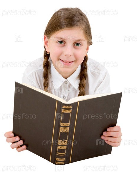 Девочка читает книгу на белом фоне