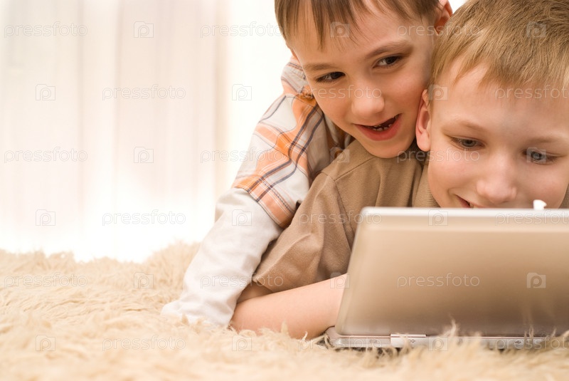 Два маленьких брата лежат на ковре с ноутбуком