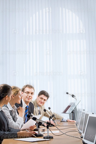 Портрет уверенных людей, сидящих за столом и обсуждающих важный вопрос в конференц-зале