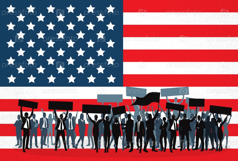 Силуэт толпы людей протеста за национальный флаг США