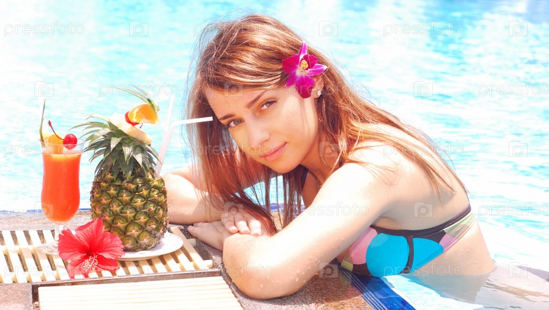 Девушка с коктейлем у бассейна