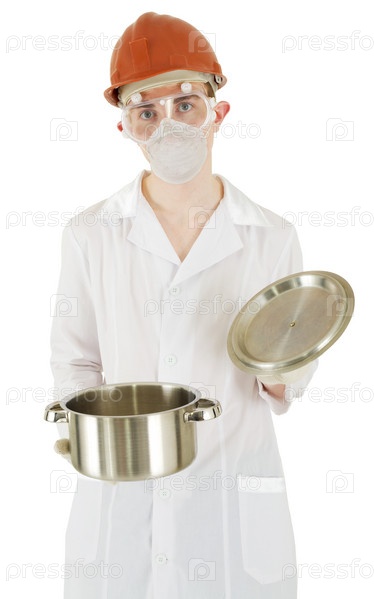 Ученый с кастрюлей в руках и удивленный выражением лица