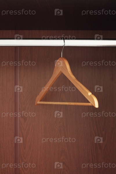 Деревянная вешалка висит в пустом шкафу на верхней стороне