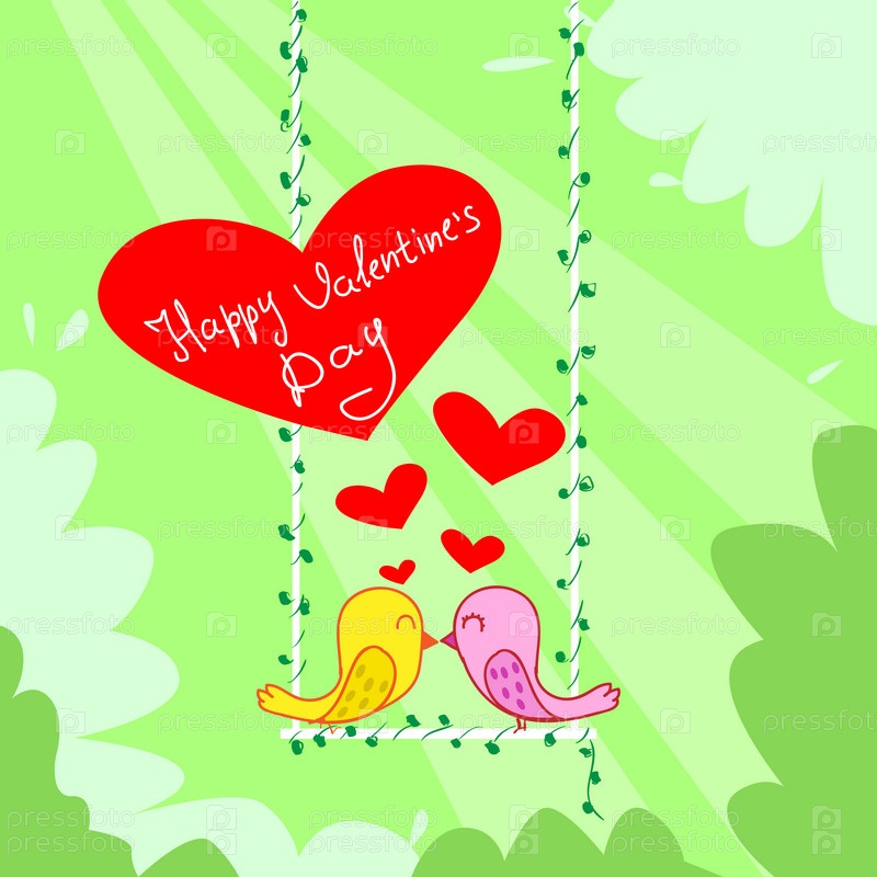 Две птицы поцелуй, сидя на качели красное сердце