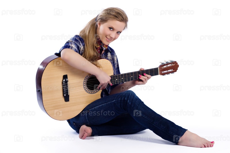 Портрет деревенской девушки в квадратной рубашке с гитарой