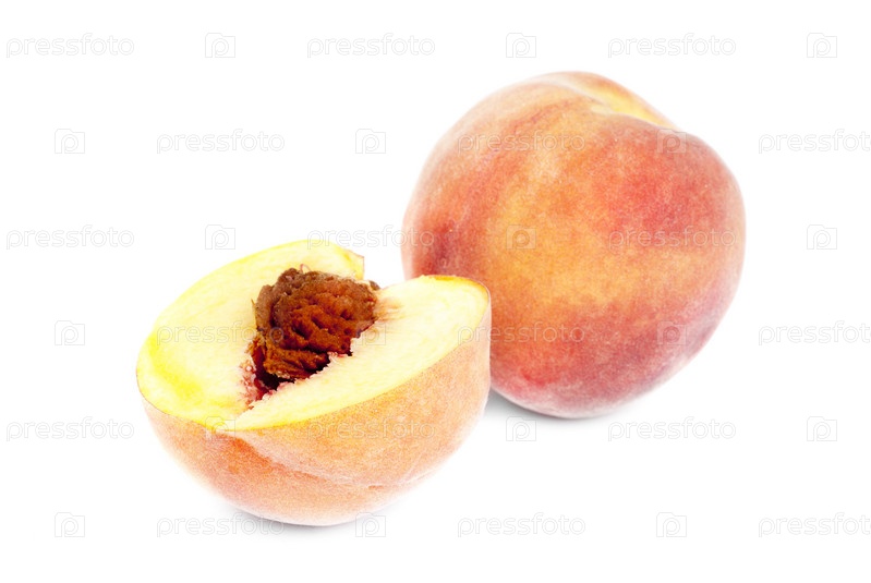 Целый персик и половинка с косточкой на белом фоне