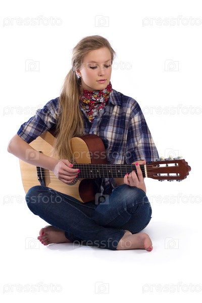 Портрет деревенской девушки в квадратной рубашке с гитарой