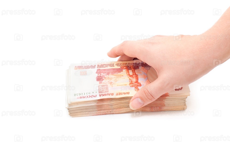 Пачка денег в руке на белом фоне