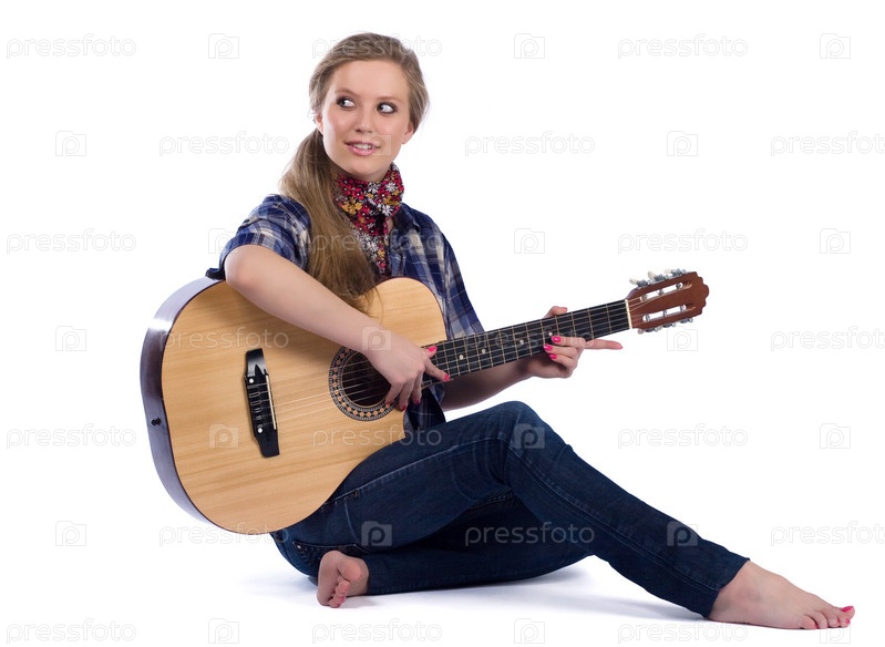 Портрет деревенской девушки в квадратной рубашке с гитарой