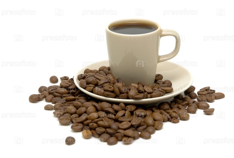 Чашка кофе и кофе в зернах на белом фоне крупным планом