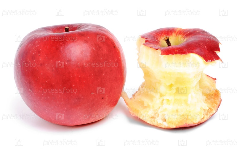 Целое яблоко и огрызок на белом фоне