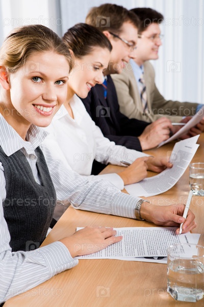 Успешная улыбающаяся молодая женщина смотрит в камеру во время семинара