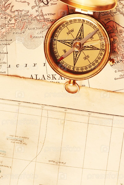Старый латунный компас на старой карте Аляски