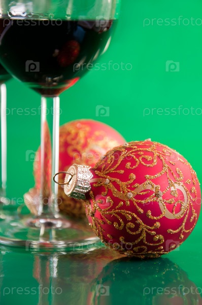 Рождественский натюрморт - бокал вина и елочные шары, на зеленом фоне