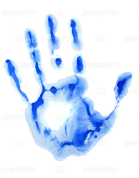 Отпечаток руки синего цвета на белом фоне
