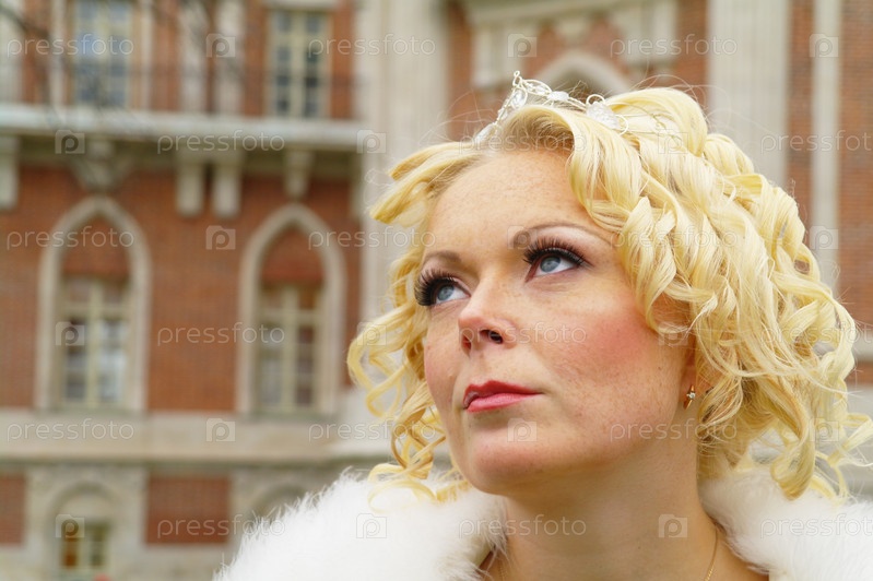 Портрет женщины блондинки в белом платье в образе королевы