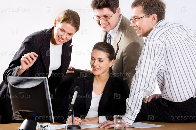 Команда из четырех успешных профессионалов собралась вокруг монитора и смотрела на него