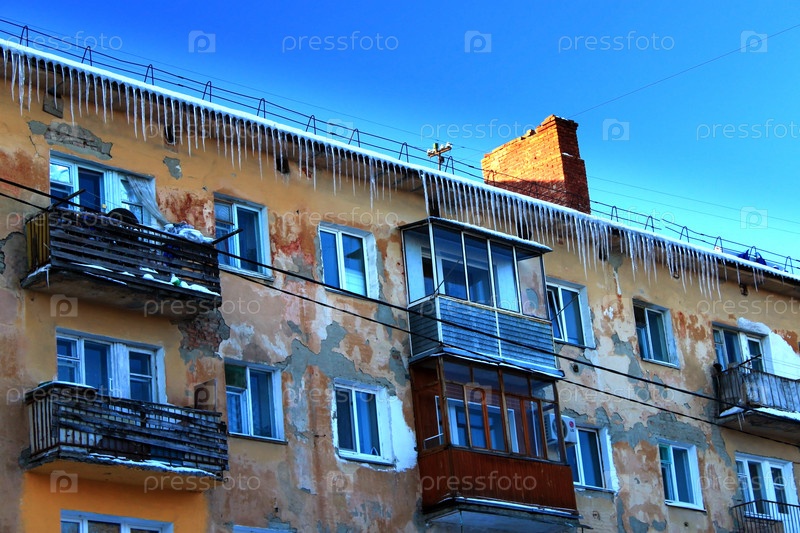 Облупившийся жилой дом на фоне голубого неба