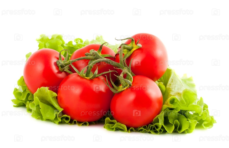 Томаты на листе салата на белом фоне