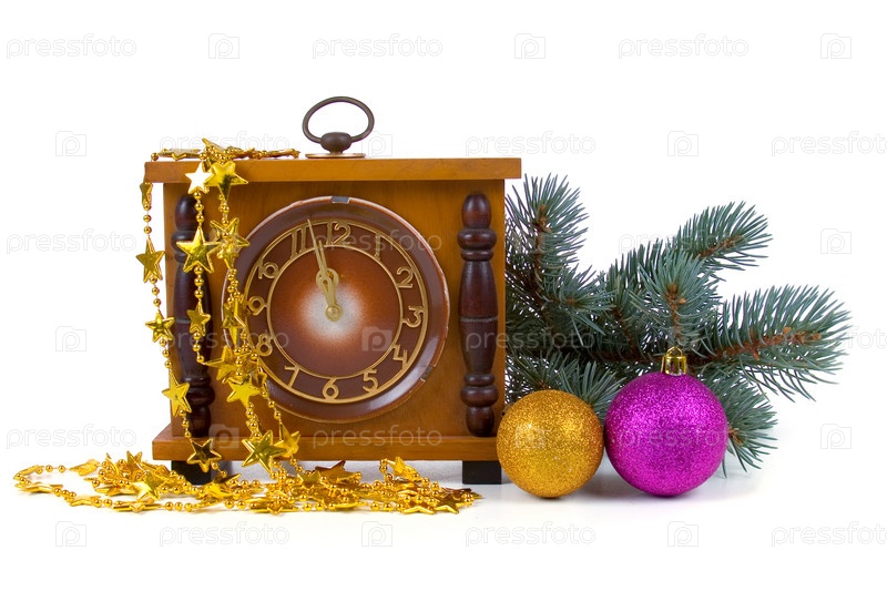 Новогодний натюрморт с часами, еловой веткой и елочными украшениями