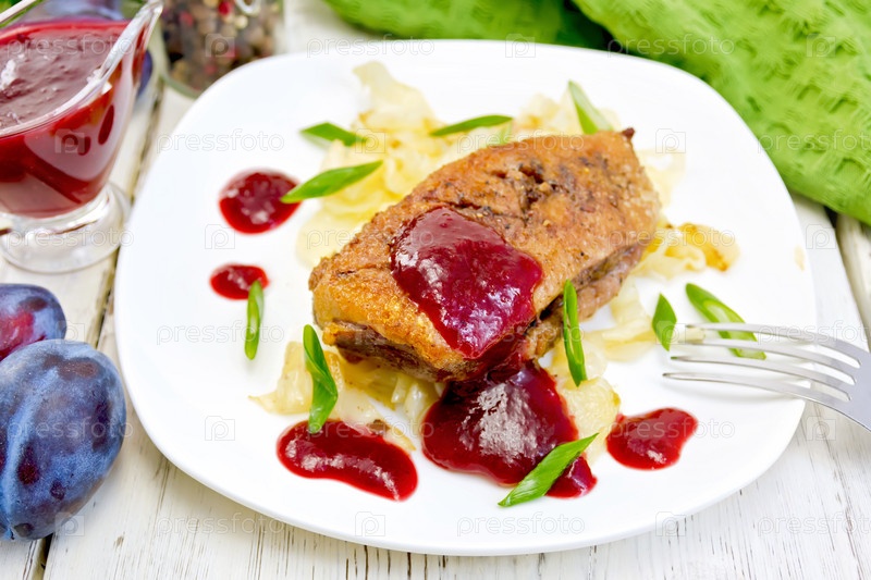 Утиная грудка целая с сливовым соусом и капустой в тарелке