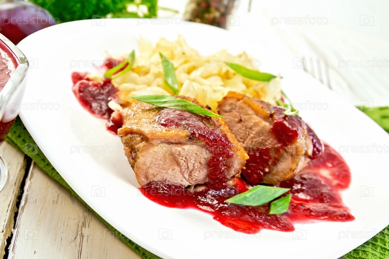 Утиная грудка с сливовым соусом и капустой в тарелке на зеленой салфетке