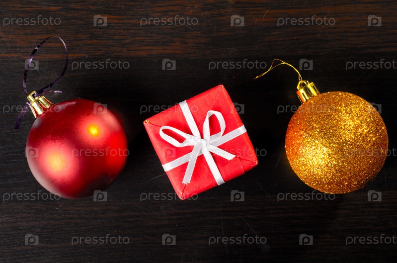 Елочные шары и рождественский подарок на деревянном офисном столе, вид сверху
