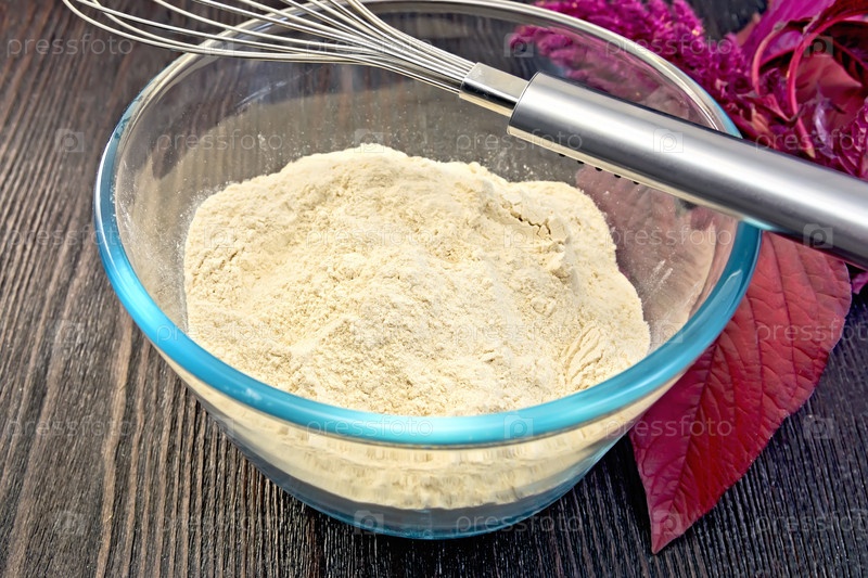 Мука амарантовая в стеклянной чаше с миксером на доске