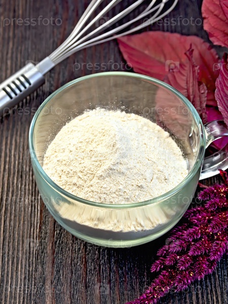 Мука амарантовая в стеклянной чашке на доске с миксером