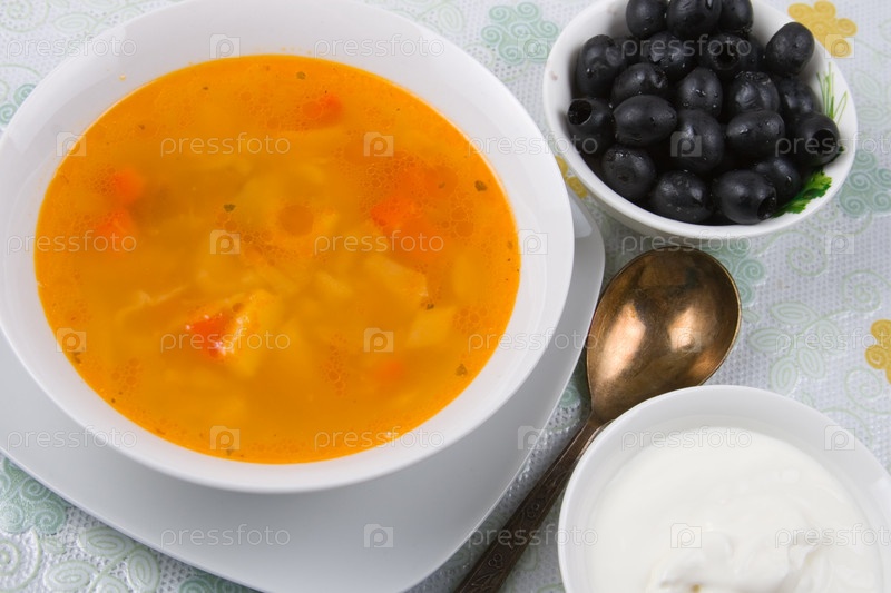 Солянка с оливками и сметаной на столе