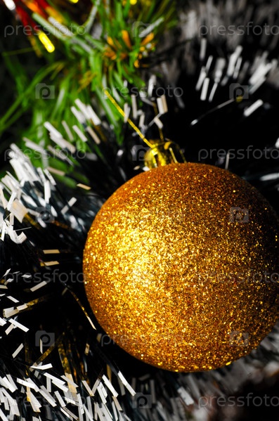 Новогодний золотистый шар, висящий на елке