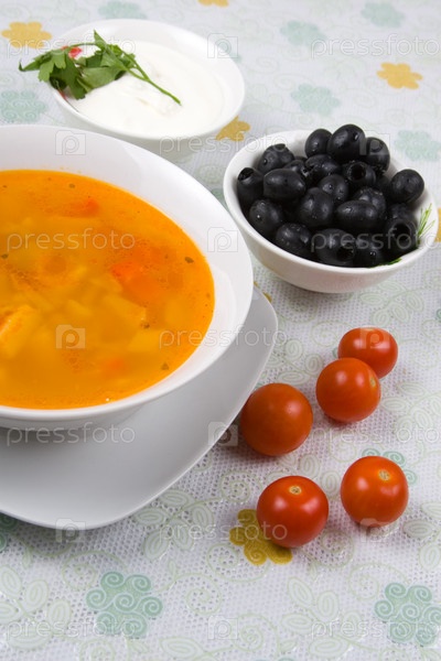 Солянка с оливками, помидорами и сметаной на столе