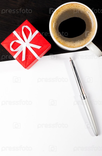 Чашка кофе, рождественский подарок с ручкой на деревянном офисном столе, вид сверху