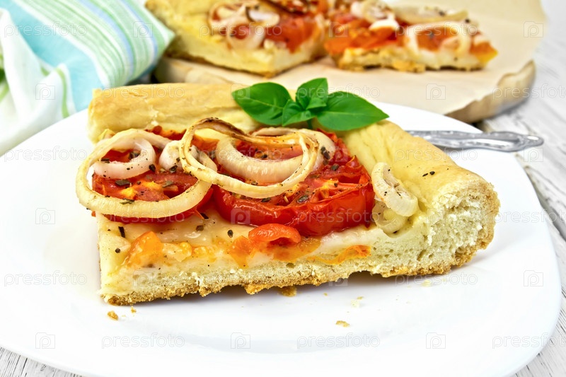 Пирог с луком и помидорами в белой тарелке на светлой доске