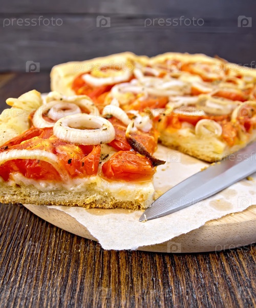 Пирог с луком и помидорами на бумаге с ножом