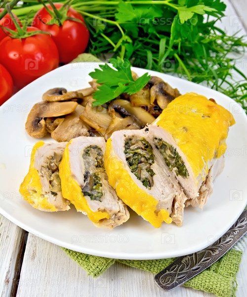 Рулет куриный с шампиньонами и сыром на доске