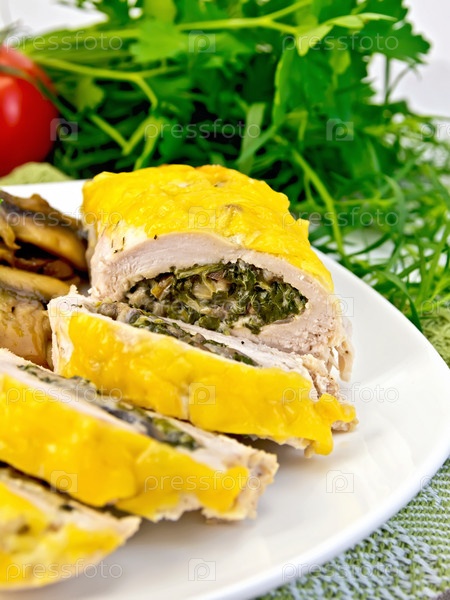 Рулет куриный с шампиньонами и шпинатом на доске