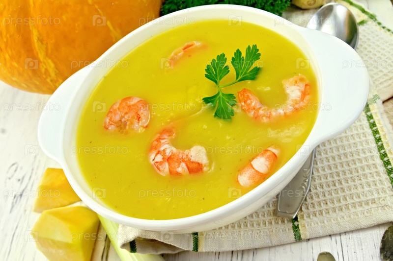 Суп-пюре тыквенный с креветками в белой чаше на доске
