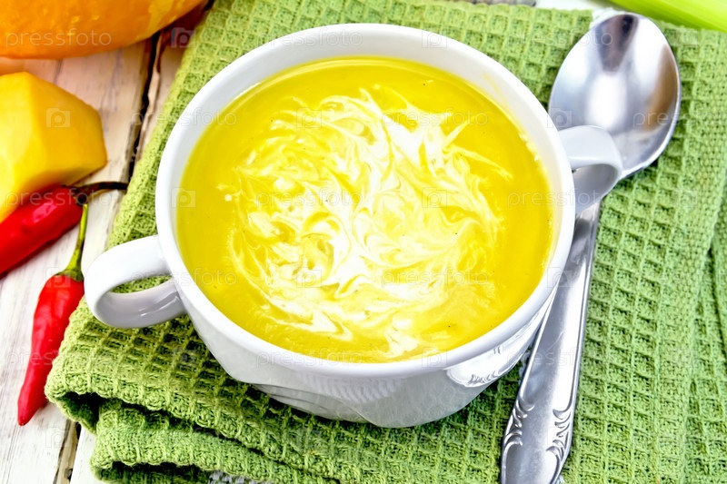 Суп-пюре тыквенный со сливками в белой чаше на салфетке