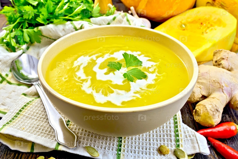 Суп-пюре тыквенный со сливками в чаше на салфетке