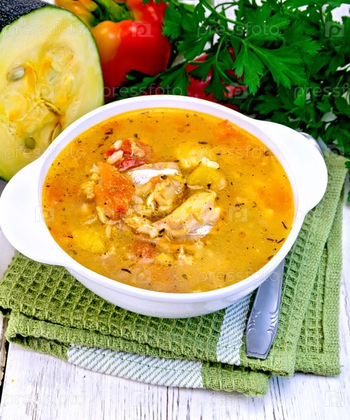 Суп рыбный с кабачком и перцем на светлой доске
