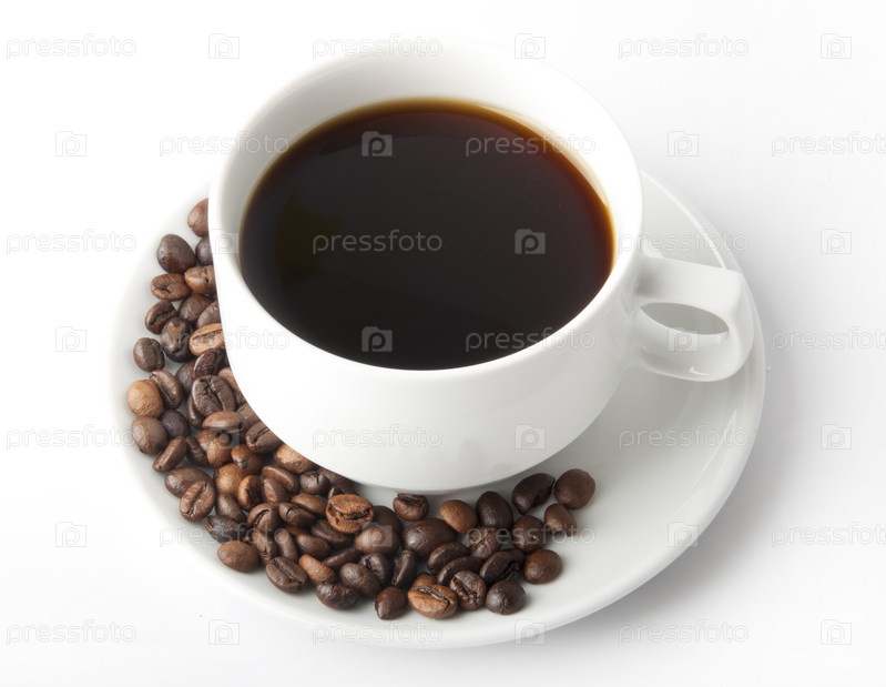 Кружка с кофе и кофейные зерна в блюдце на белом фоне