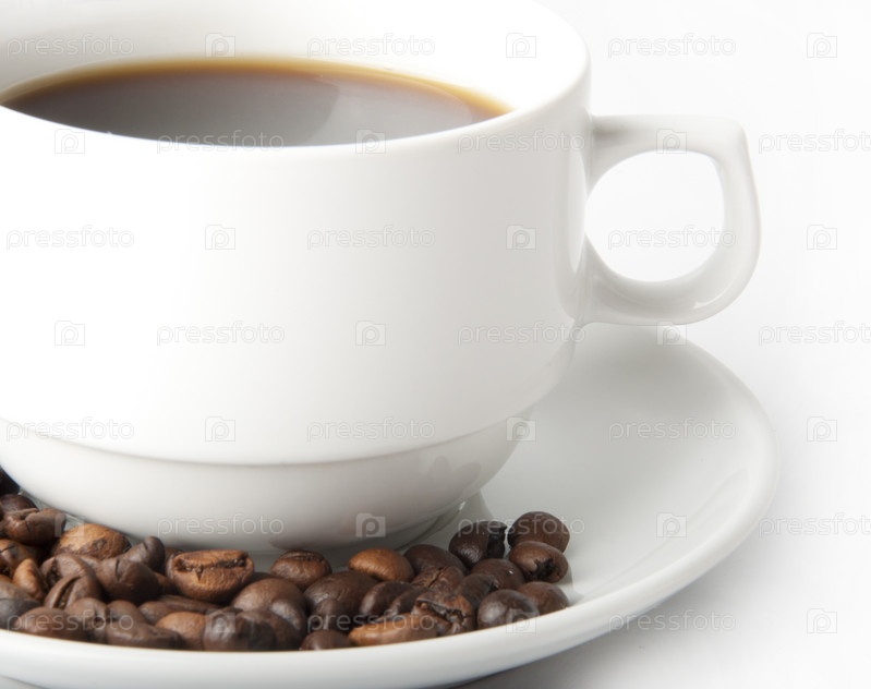 Кружка с кофе и кофейные зерна в блюдце на белом фоне