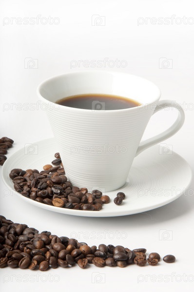 Кружка с кофе и кофейные зерна в блюдце на белом фоне